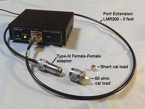 This picture shows the LMR200 extension cable. The cable has male connectors on each end so a female-female adapter is used to make the extension cable compatible with the RF connector on the front panel of the AIMuhf. The type-N cal loads normally used for the AIMuhf are shown.