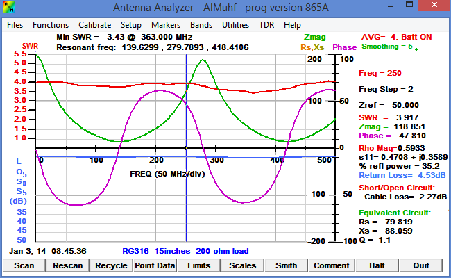 This is a scan of a test cable consisting of 15 inches (38 cm) of RG316 terminated with a 200 ohm chip resistor. |